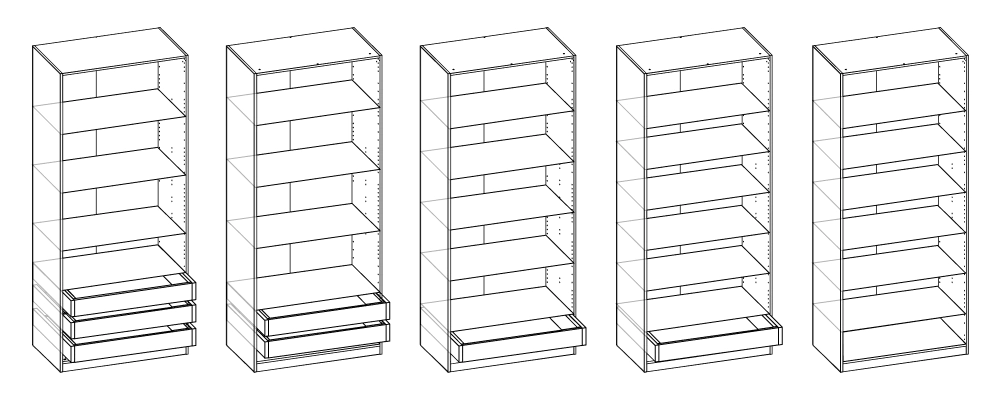 Исходя из того, какие вещи будут храниться в каждом модуле, подберите нужное количество полок и выдвижных ящиков.