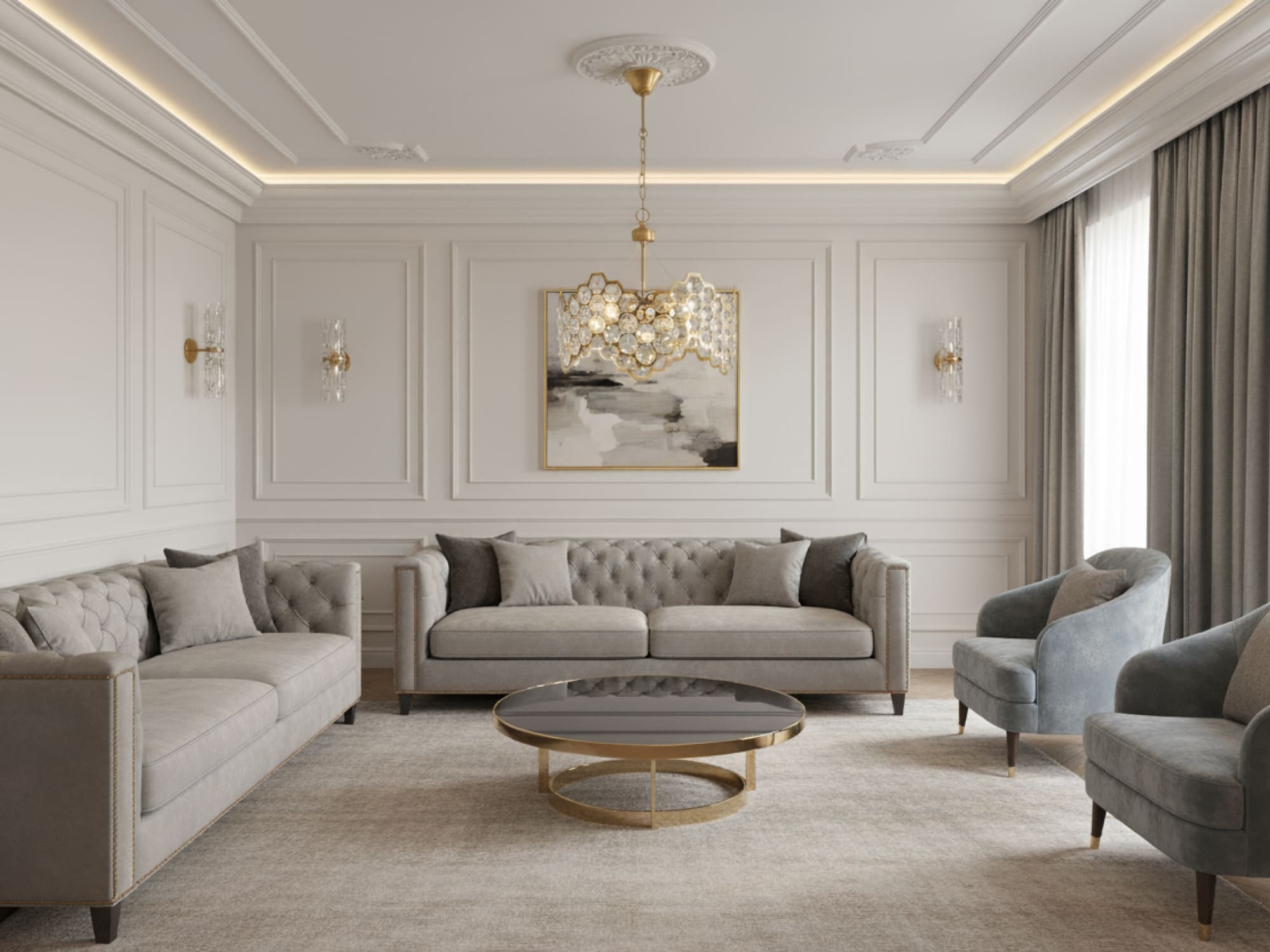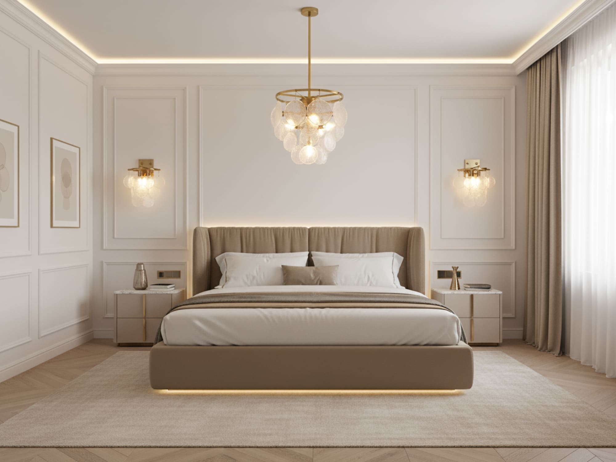 Неоклассический стиль сохраняет элегантность классики, но упрощает декор, делая акцент на симметрии, чистых линиях и сдержанной роскоши: здесь чаще встречаются гладкие поверхности, геометрические мотивы и материалы вроде матового металла или стекла. Палитра — приглушённая: белый, бежевый, серый, тёмно-бордовый или тёмно-синий с лёгкими золотистыми или серебряными акцентами, а светильники (например, хрустальные люстры или бра с простыми силуэтами) обеспечивают мягкое, равномерное освещение без излишней пышности.