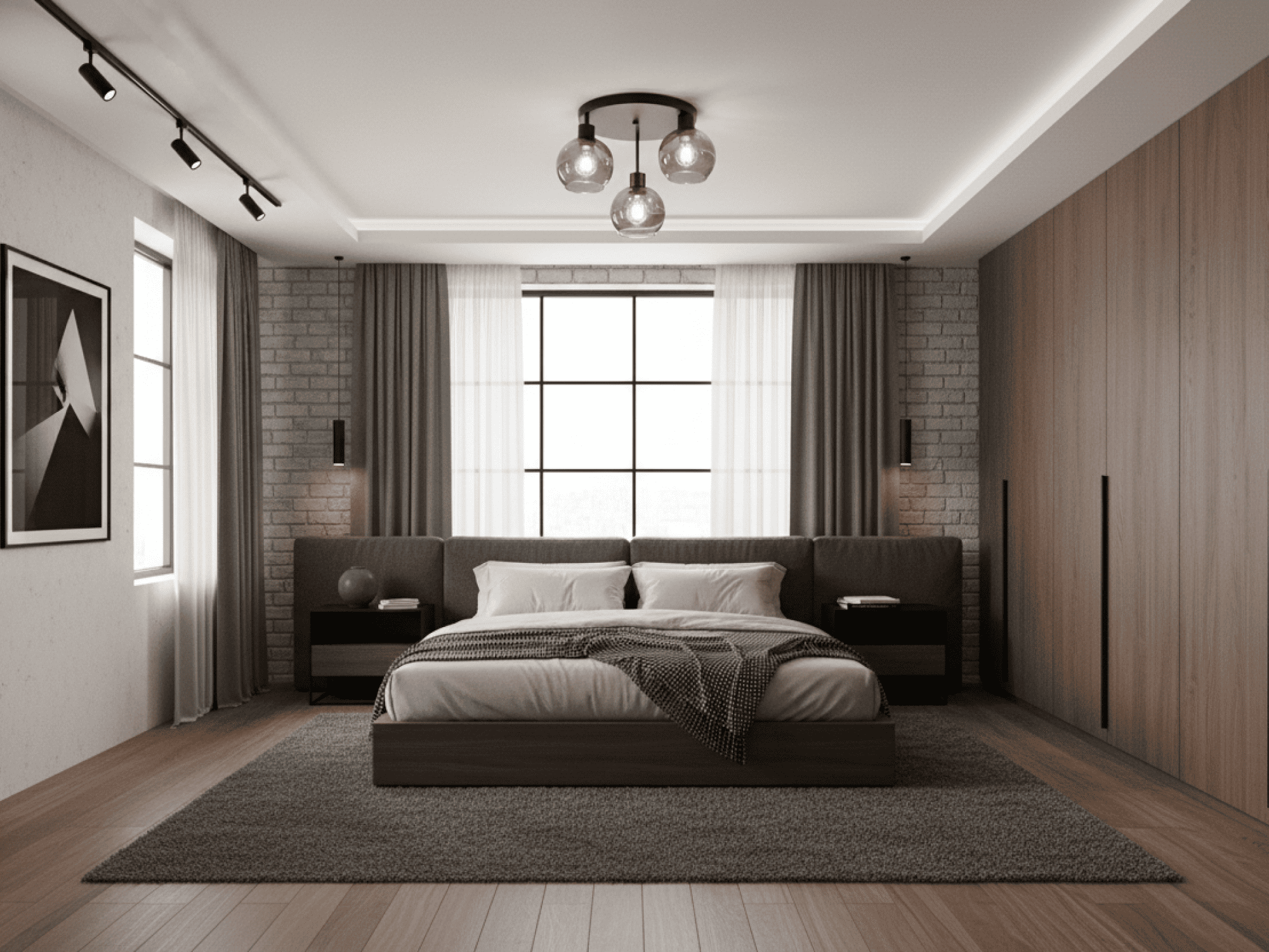 Лофт - это баланс индустриальной грубости и уютного тепла, где металлические элементы (трубы, кованые детали, латунь) сочетаются с натуральными текстурами (дерево, кожа, бетон). Цветовое исполнение: оттенки черного, приглушённые терракотовые, серо-бежевые, кремовые или тёмно-синие с акцентами состаренного металла, создающие атмосферу вольного, но комфортного пространства.
