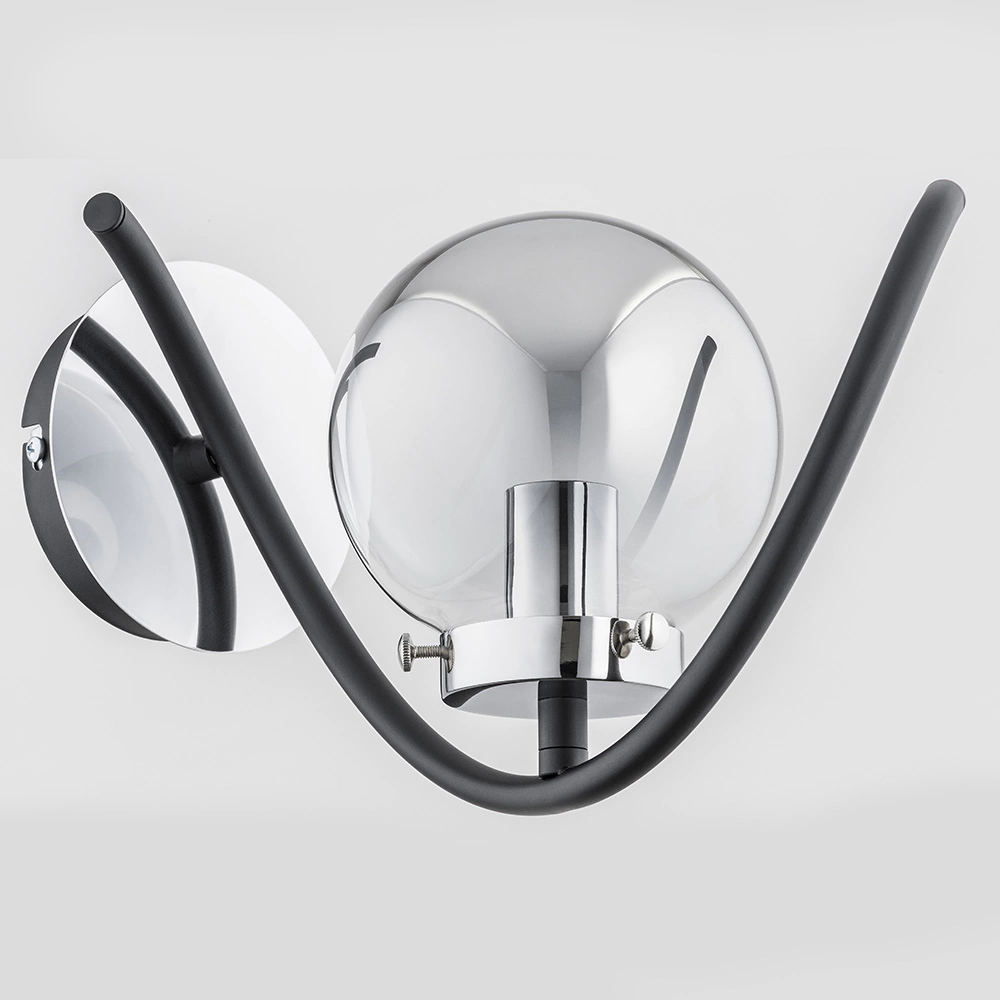 Основание цвета хром, черный изогнутый рожок и тонированный стеклянный плафон шарообразной формы составляют конструкцию изделия.