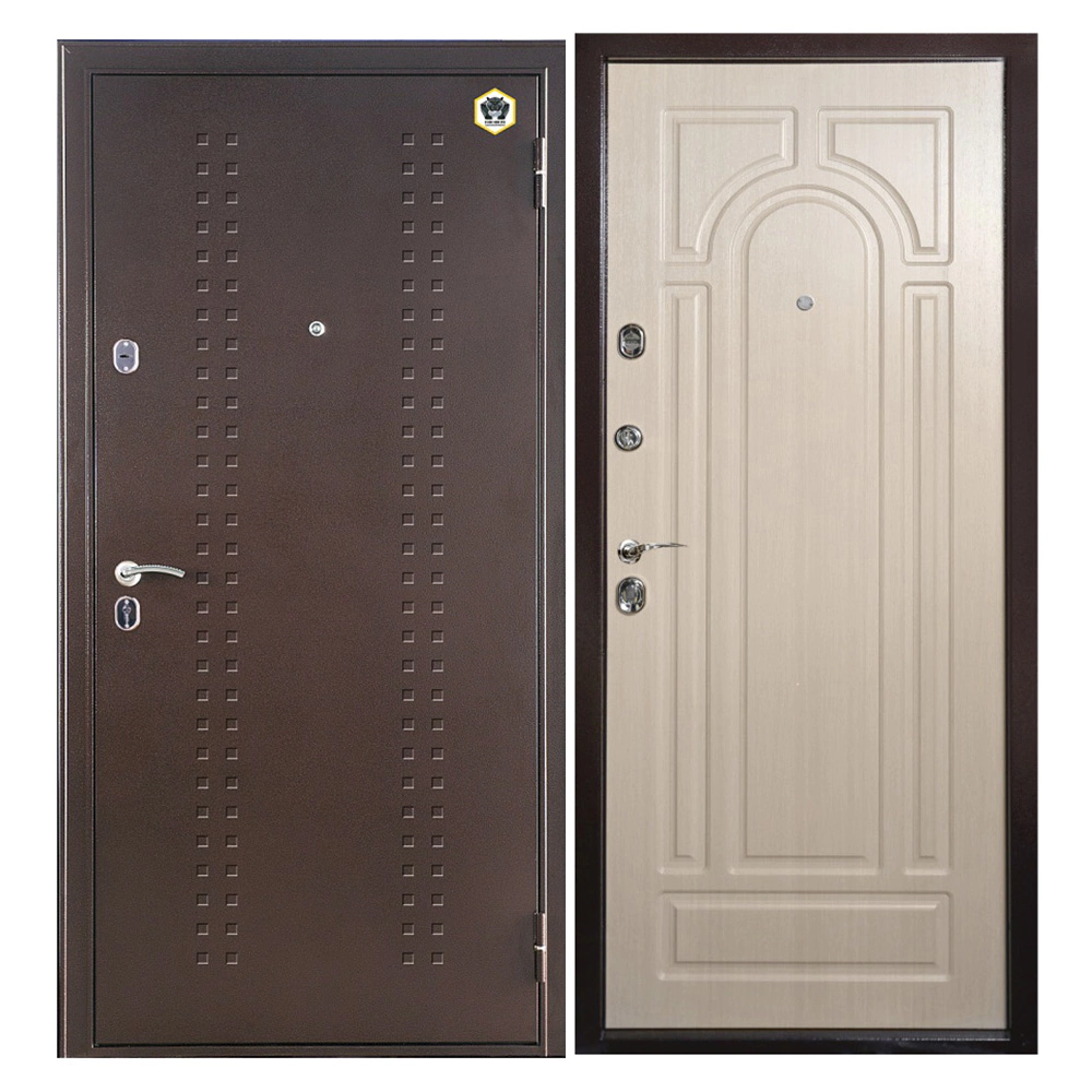 Наружная сторона данной двери покрыта порошковым составом. Такая покраска отличается стойкостью к влаге, изменению температур, лёгким повреждениям. Внутри дверная створка обшита ламинированными листами, имитирующими древесный рисунок. Запирающим механизмом служит трёхригельный сувальдный замок, дополненный ручной задвижкой.