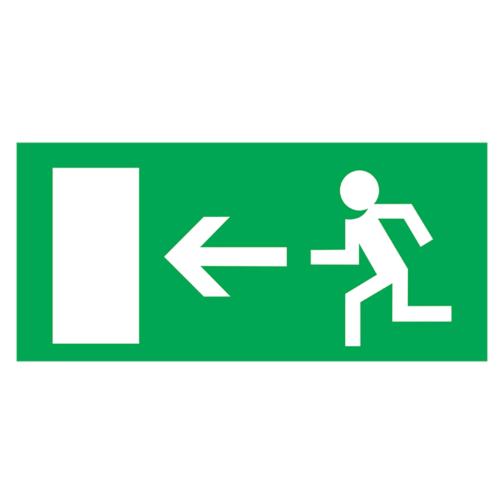 Эвакуационный знак 'Направление к эвакуационному выходу налево' - этот знак (код E 04 ГОСТ Р 12.4.026-2001) используется на стенах помещений для указания направления движения к эвакуационному выходу.