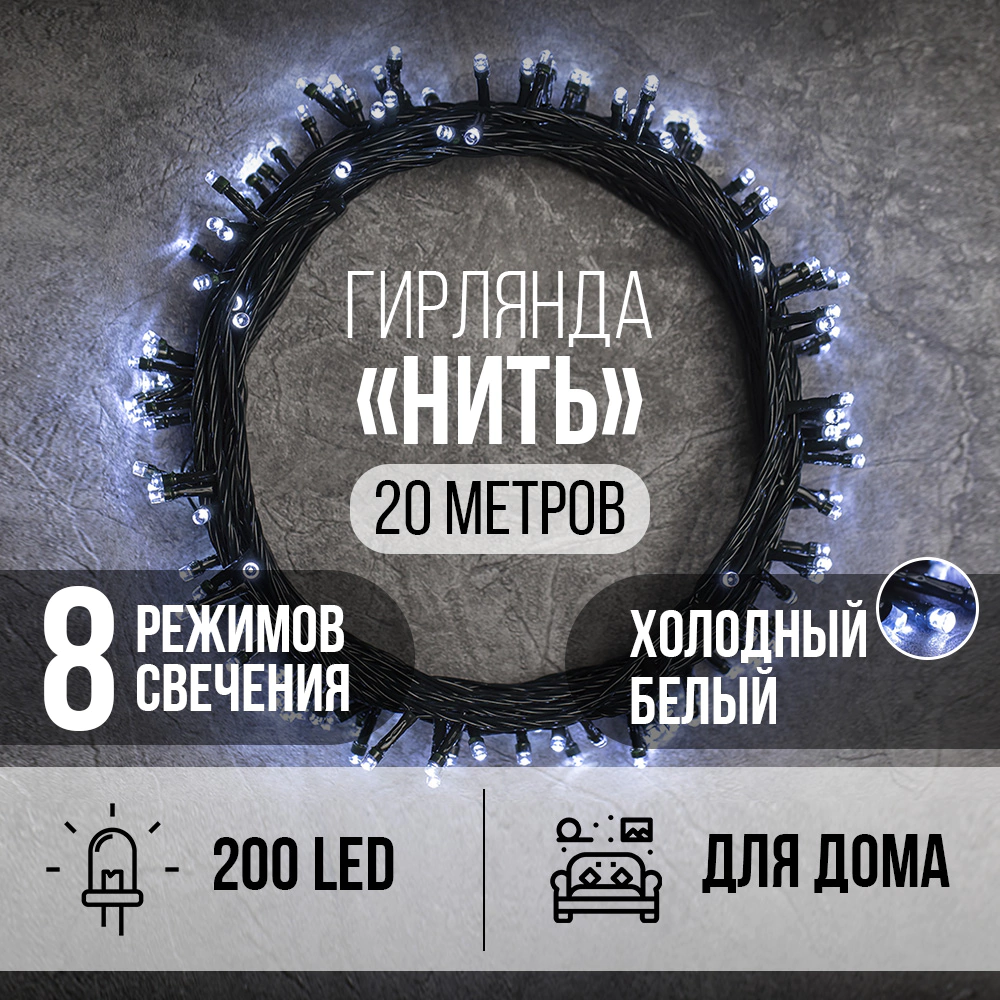 Гирлянда Нить 200LED 20 м холодный белый свет, зеленый провод IP20 ПВХ, 8 функций