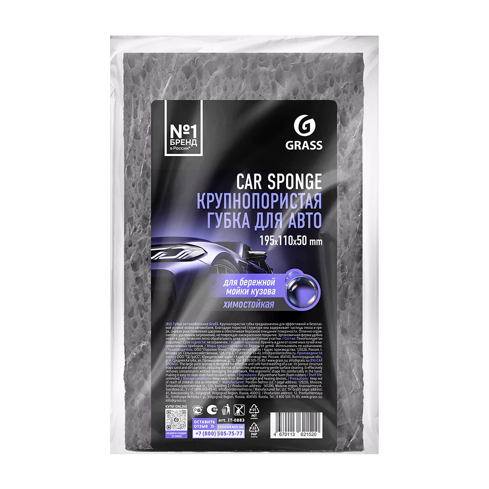 Губка для мытья авто крупнопористая серая Grass