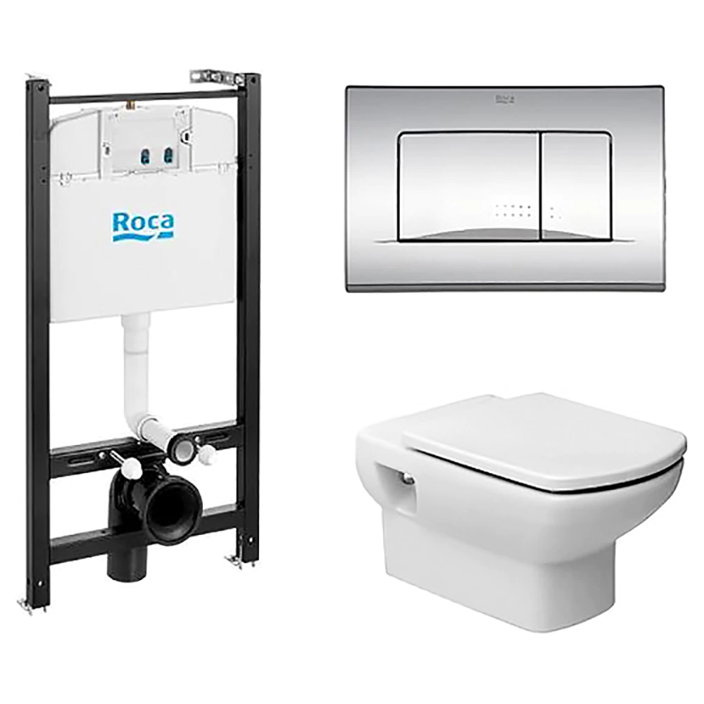 Подвесной унитаз Roca Dama Senso 893104090 с крышкой-сиденьем Soft Close, в комплекте с инсталляцией Roca Active и с хромированной клавишей двойного смыва. Готовое решение: все необходимое в одной упаковке.