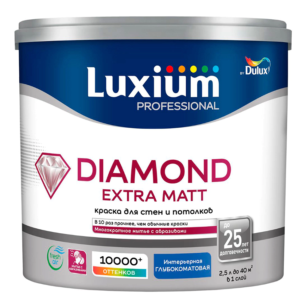 Краска для стен и потолков 2,5 л белая (база BW) Diamond Extra Matt Luxium и другие товары категории Дисперсионные краски для внутренних работ доступны в каталоге Краски и строительная химия интернет-магазина Бауцентр по низким ценам. Ознакомьтесь с подробными характеристиками и описанием, а также отзывами о данном товаре, чтобы сделать правильный выбор и заказать товар онлайн.