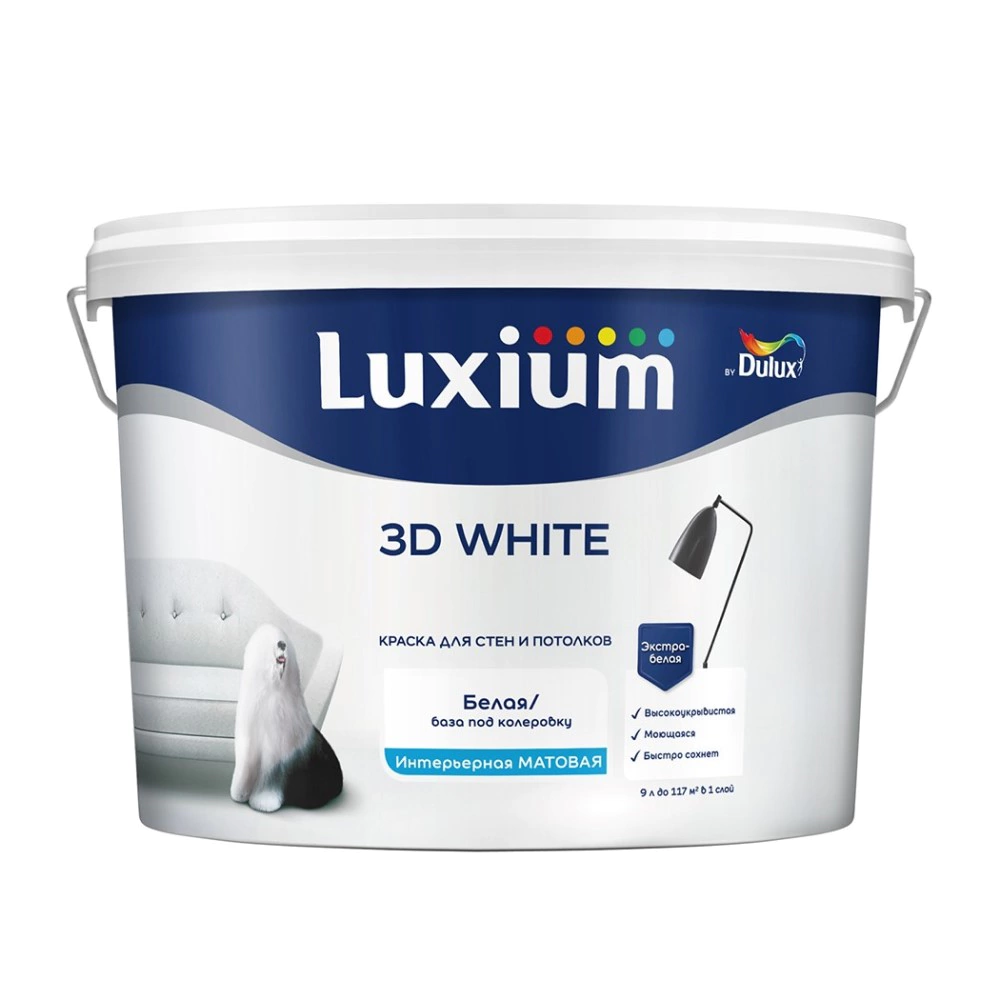 Краска для стен и потолков 9 л белая (база BW) 3D White Luxium и другие товары категории Дисперсионные краски для внутренних работ доступны в каталоге Краски и строительная химия интернет-магазина Бауцентр по низким ценам. Ознакомьтесь с подробными характеристиками и описанием, а также отзывами о данном товаре, чтобы сделать правильный выбор и заказать товар онлайн.