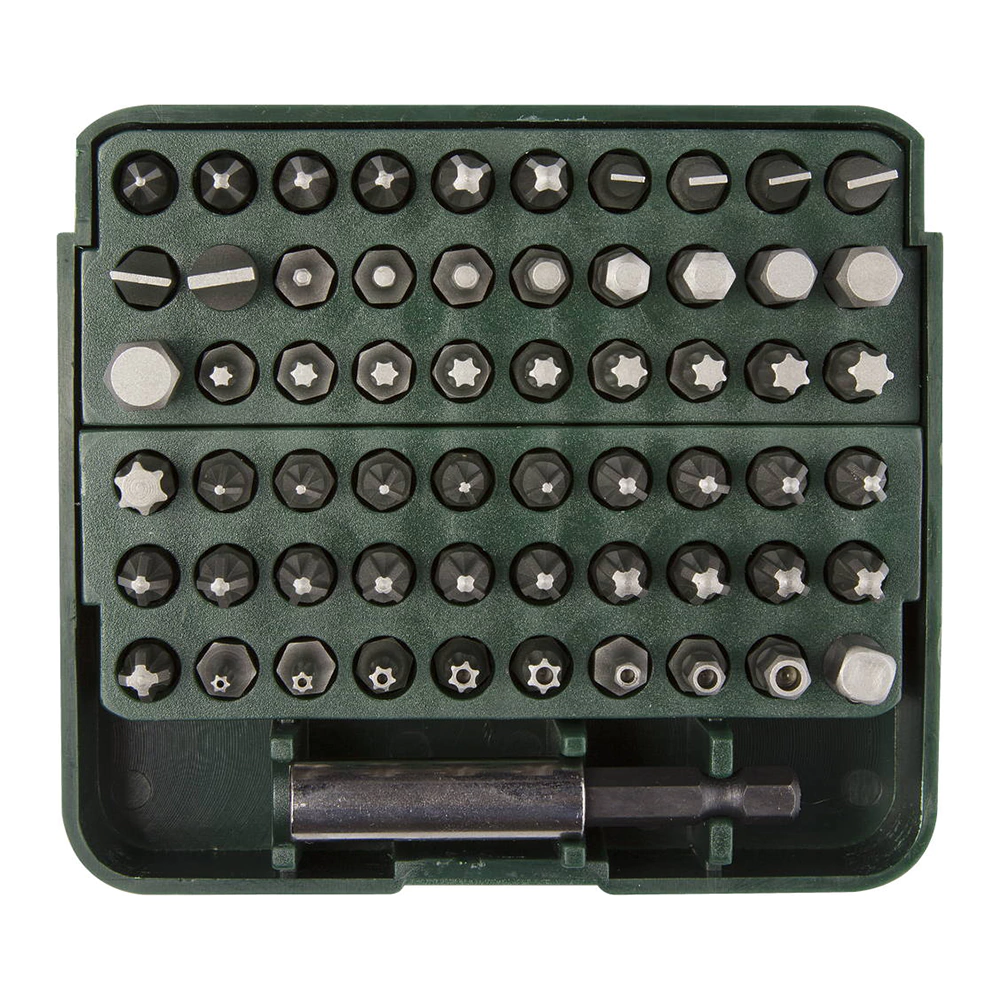 Удлинитель-адаптер с магнитным держателем для бит - 1 шт, переходник для торцевых головок 1/4" - 1 шт, 59 бит: 25 мм (SL 4 мм, SL 4.5 мм, SL 5 мм, SL 6 мм, SL 7 мм, SL 8 мм; PH№1; PH№2 - 3 шт; PH№3 - 2 шт; PZ№1 - 5 шт, PZ№2 - 10 шт; PZ№3 - 5шт; HEX: 2 мм, 2,5 мм, 3 мм, 4 мм, 5 мм, 5,5 мм, 6 мм, 7 мм, 8 мм; TORX: T10, T15 - 2 шт, T20 - 2 шт, T25 - 2шт, T27, T30, T40; TORX HOLE: T8, T10, T15, T20, T25; Square: 3 мм, 4 мм,5 мм; пластиковый кейс