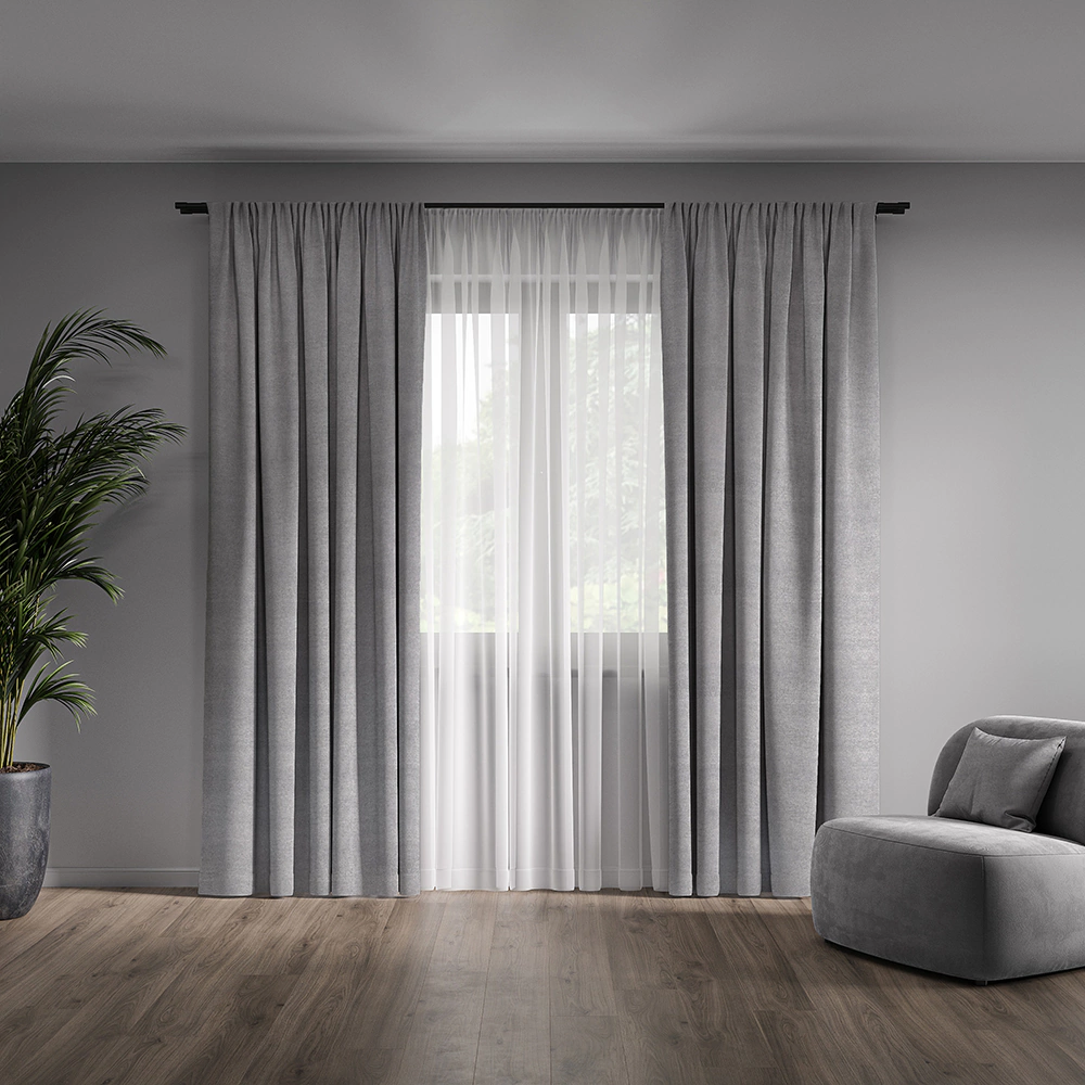Штора подшита со всех сторон, оснащена шторной лентой. Подходит для всех видов карнизов.