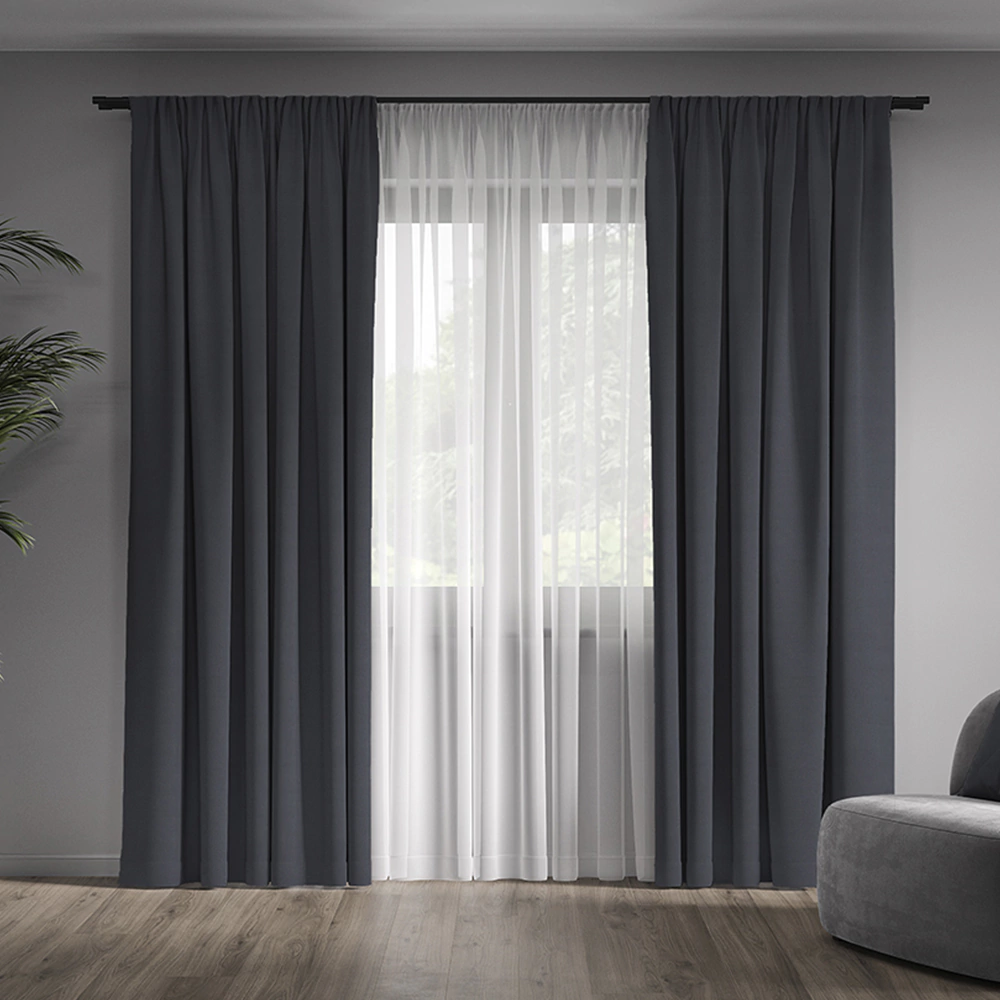 Штора подшита со всех сторон, оснащена шторной лентой. Подходит для всех видов карнизов.