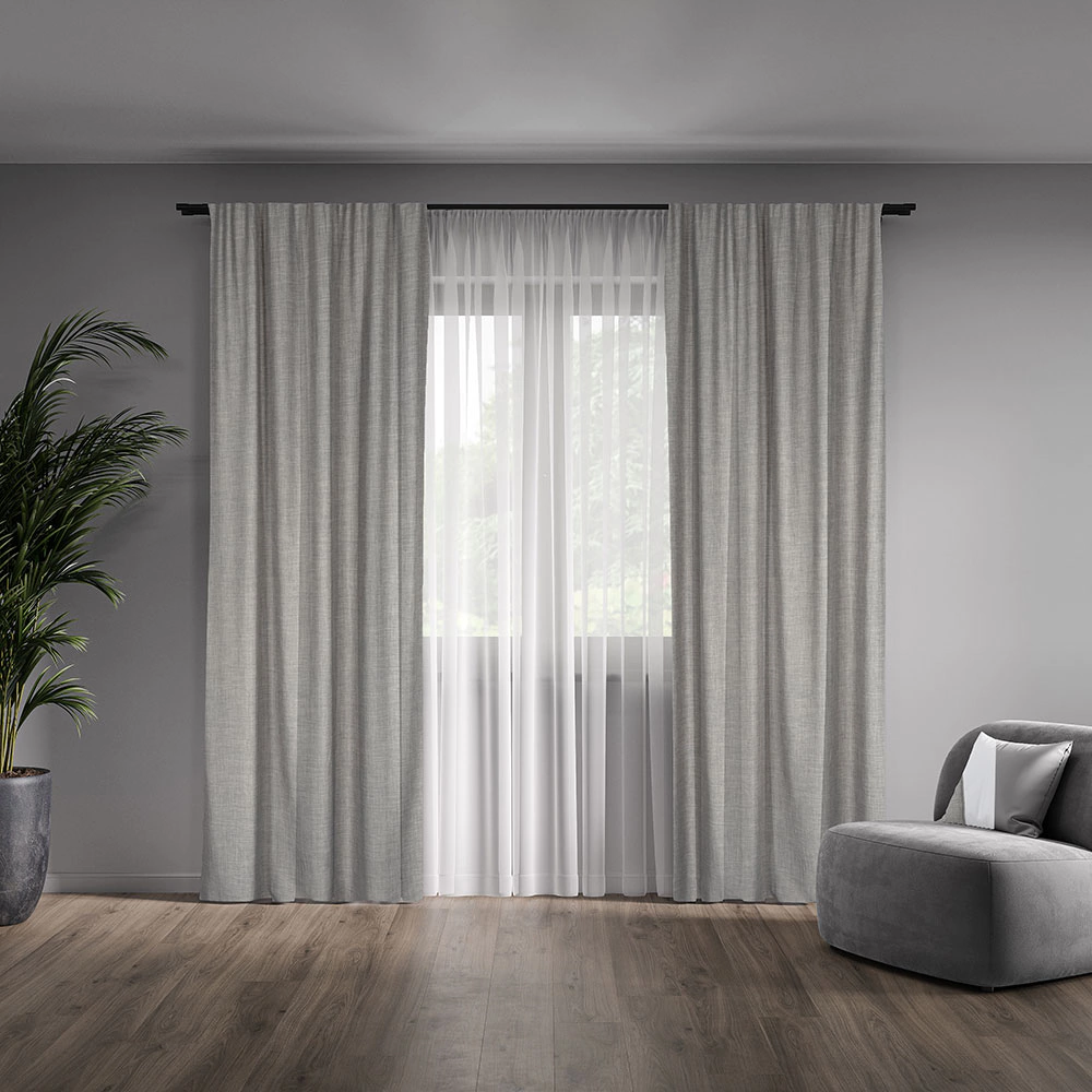Подшита со всех сторон. Оснащена шторной лентой и кулиской для круглого карниза диаметром до 4 см.