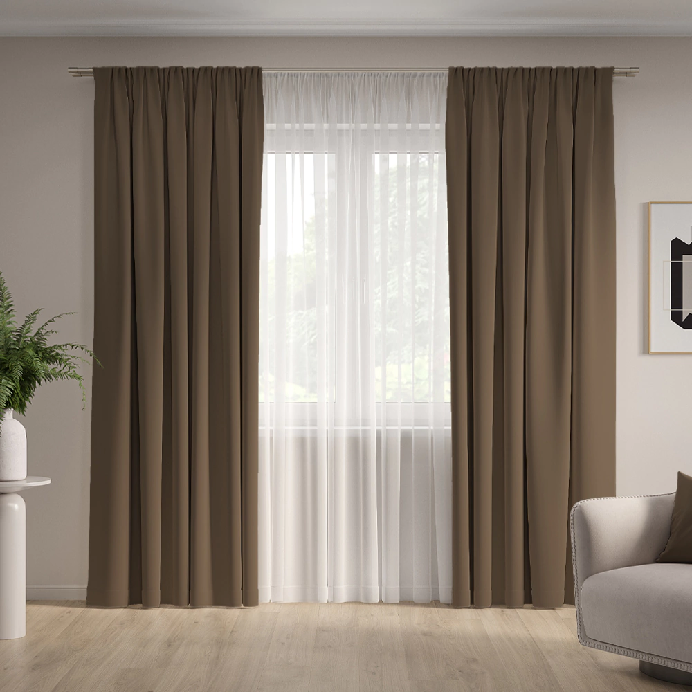 Штора подшита со всех сторон, оснащена шторной лентой. Подходит для всех видов карнизов.