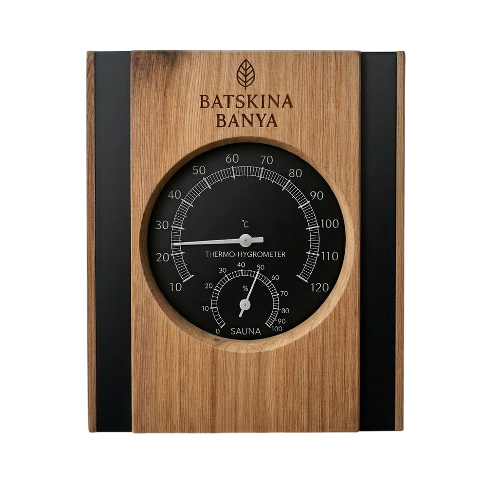 Функциональный и стильный прибор для измерения температуры и влажности воздуха в бане или сауне.
