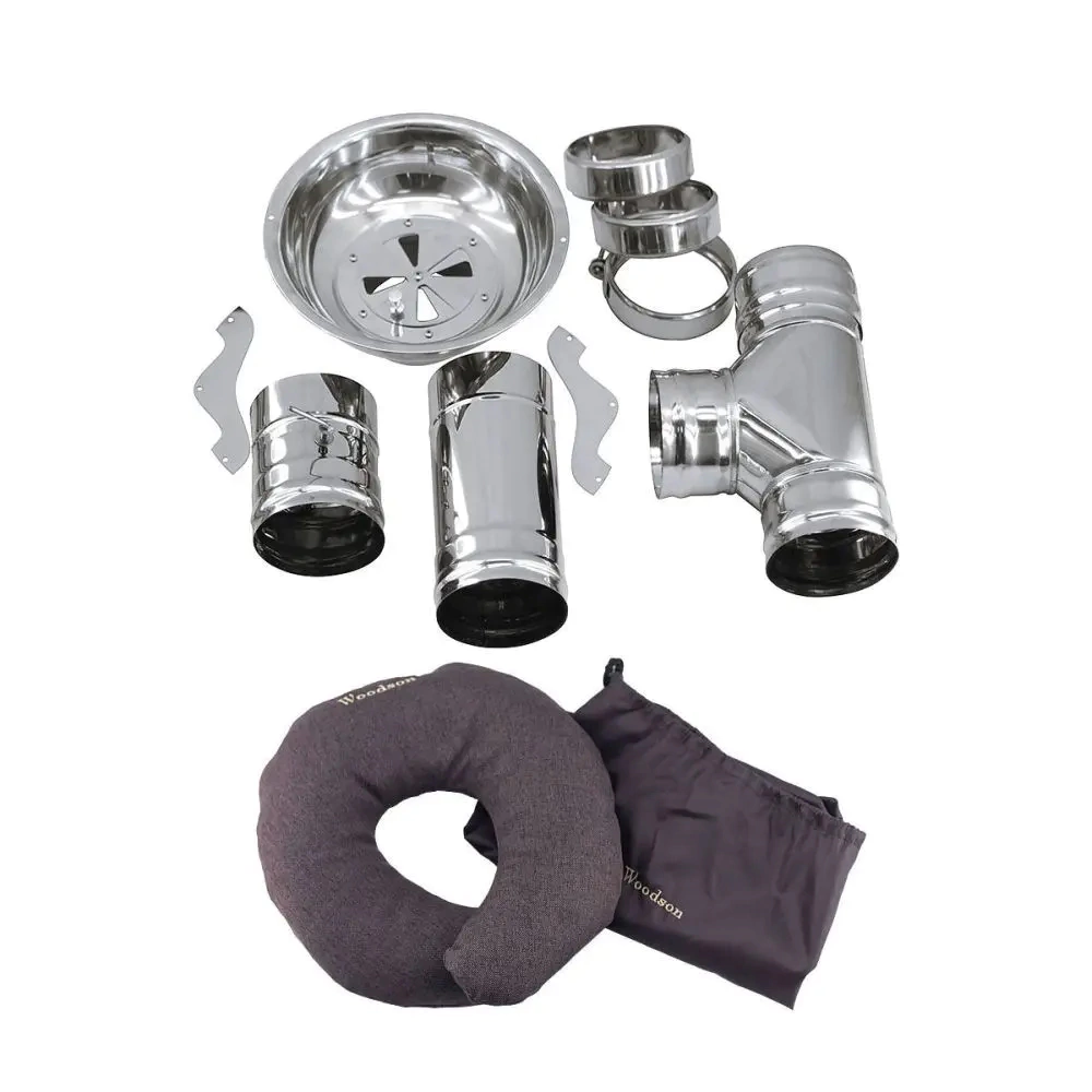 подушка (серая либо коричневая) - 1 шт, опора - 2 шт, чаша - 1 шт, тройник с заглушкой (конденсатоотвод) - 1 шт, труба d115 длиной 0,25 м - 1 шт, шибер-поворотный d115 длиной 0,15 м - 1 шт, хомут обжимной d115 - 3 шт, вентиляционная решетка - 1 шт